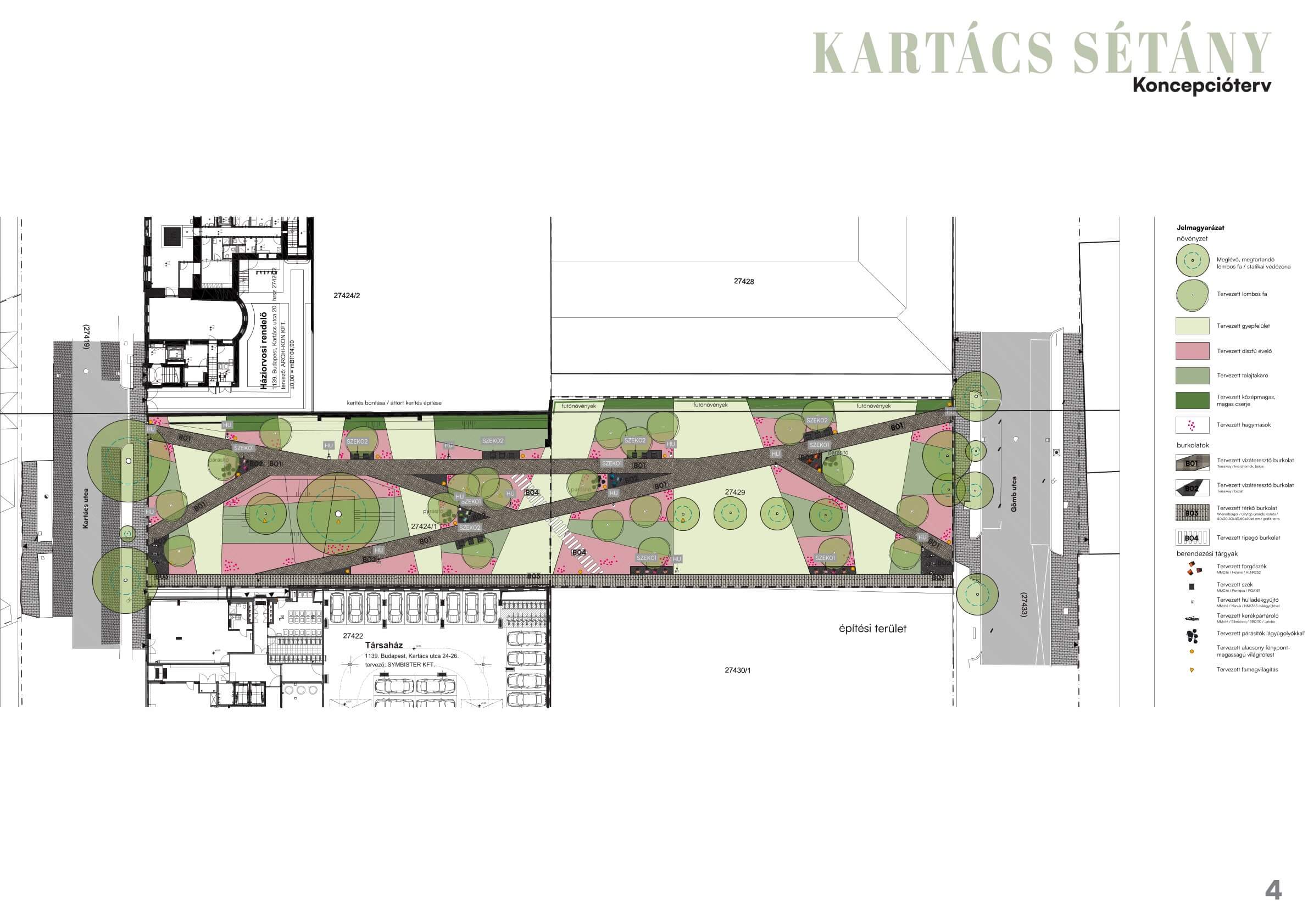 A koncepcióterv alapján a zöldsétány tagolt, mégis jól átlátható térszerkezetet kap. A sétány vonalvezetése végigvezeti a gyalogosokat a területen, miközben kisebb pihenőzsebek nyílnak le róla, ahol padok, forgószékek és árnyékolt ülőhelyek kapnak helyet. A burkolatok meleg tónusú térkőből és klinkertéglából készülnek, amelyek természetes, időtálló megjelenést adnak a területnek, és jól illeszkednek a környező új épületekhez.