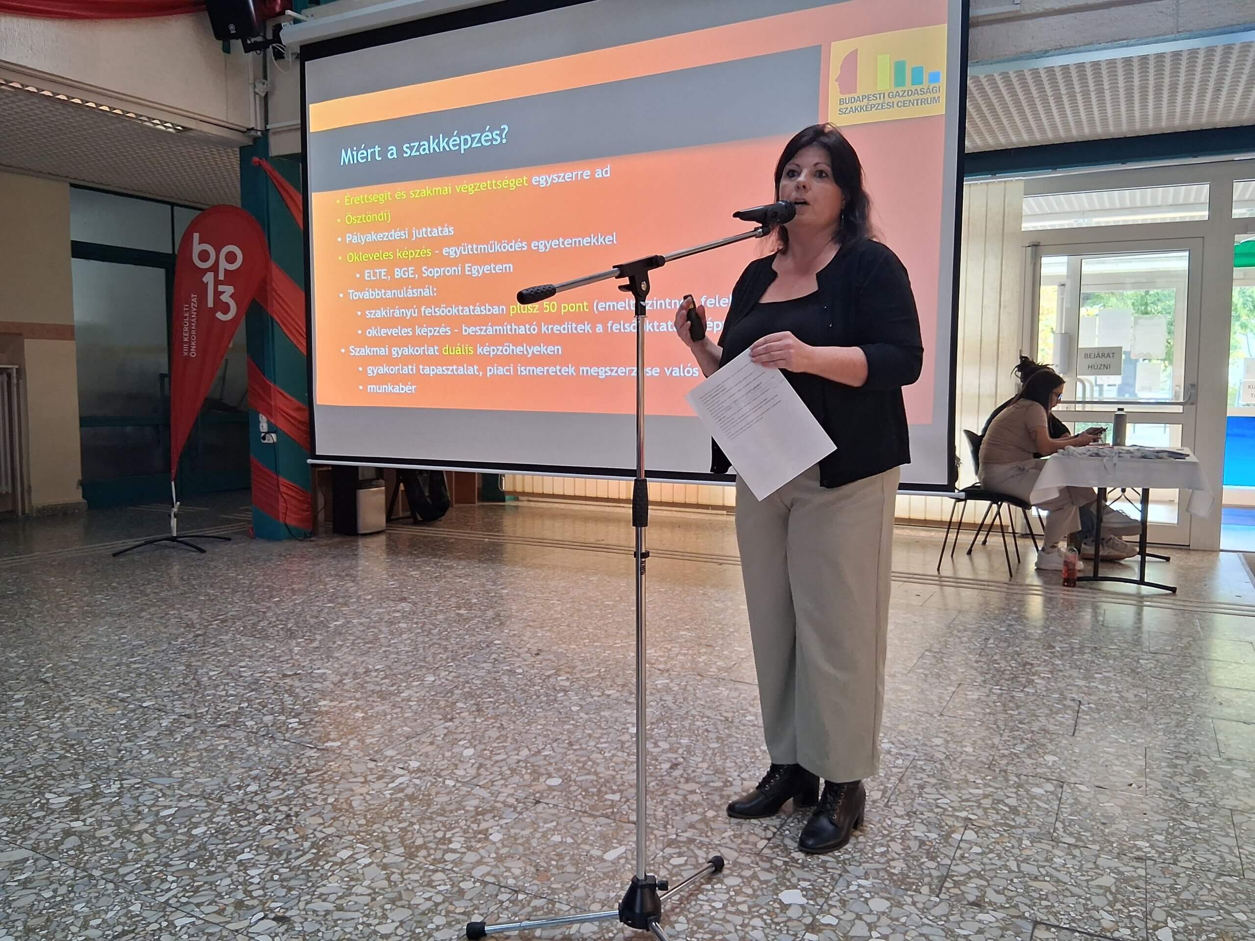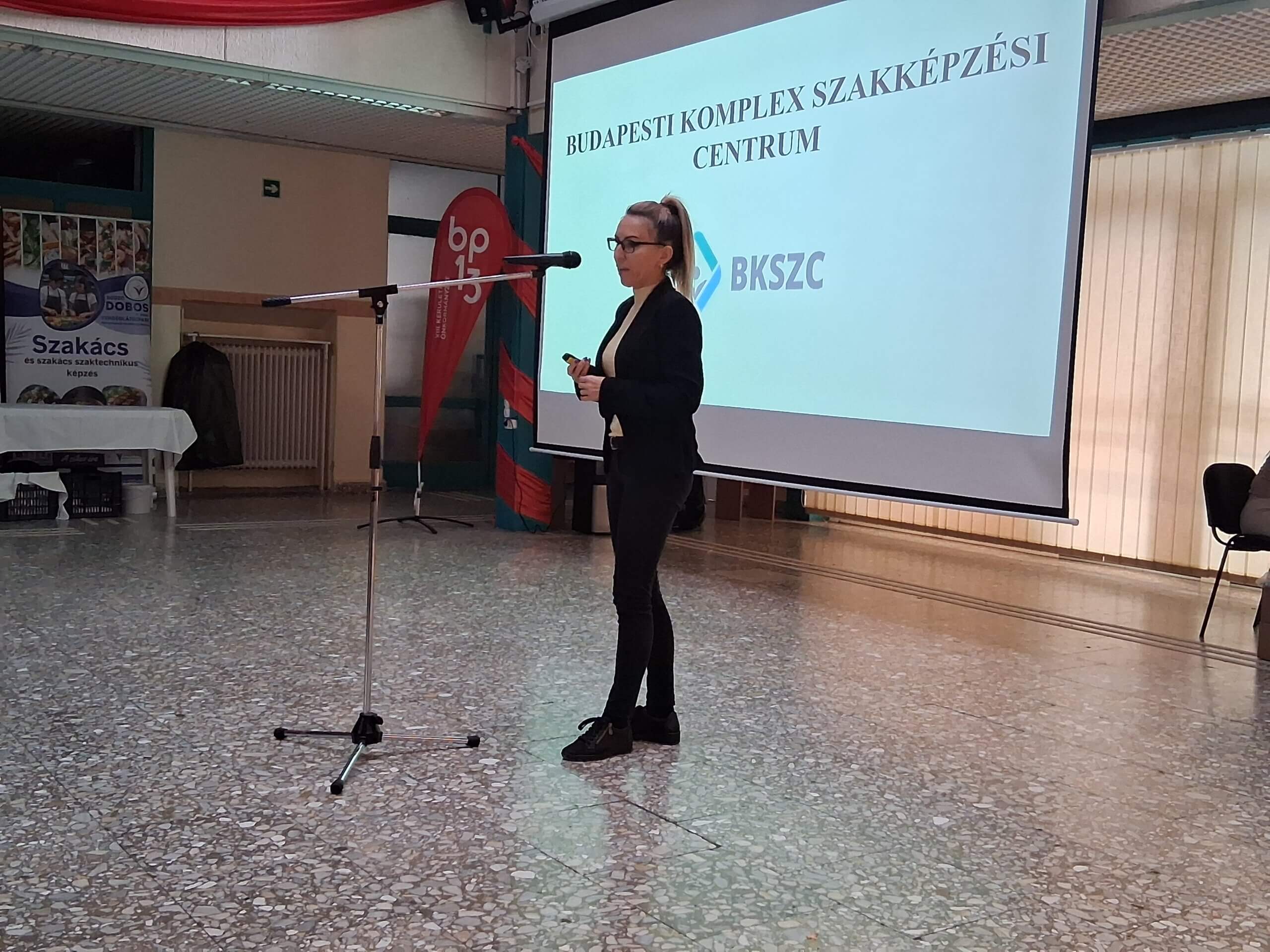Az esemény a továbbiakban a megjelent szakképzési centrumok szakembereinek tájékoztató előadásaival folytatódott. Elsőként Keszthelyi Mónika, a Budapesti Gépészeti Szakképzési Centrum munkatársa mutatta be a központ illetékességi körébe tartozó tanintézeteket, a választható szakirányokat és képzési formákat, majd Péterné Hintós Andrea, a Budapesti Gazdasági Szakképzési Centrum képviselője és munkatársa dr. Végvári Éva ismertették a gazdasági területen tevékenykedő szakiskolákban folyó munkát. A tájékoztató, rendkívül érdekes, sokirányú és informatív előadások sorát Redeléné Molnár Tímea, a Budapesti Komplex Szakképzési Centrum szakembere zárta.